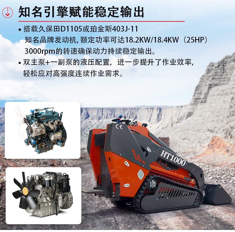 HT1000滑移裝載機(jī)以硬核參數(shù)打造高效作業(yè)體驗(yàn),搭載0.14m3容積鏟斗,配合1100kg的強(qiáng)勁傾翻能力與475kg裝載重量,輕松應(yīng)對(duì)中小型裝載、轉(zhuǎn)運(yùn)需求。