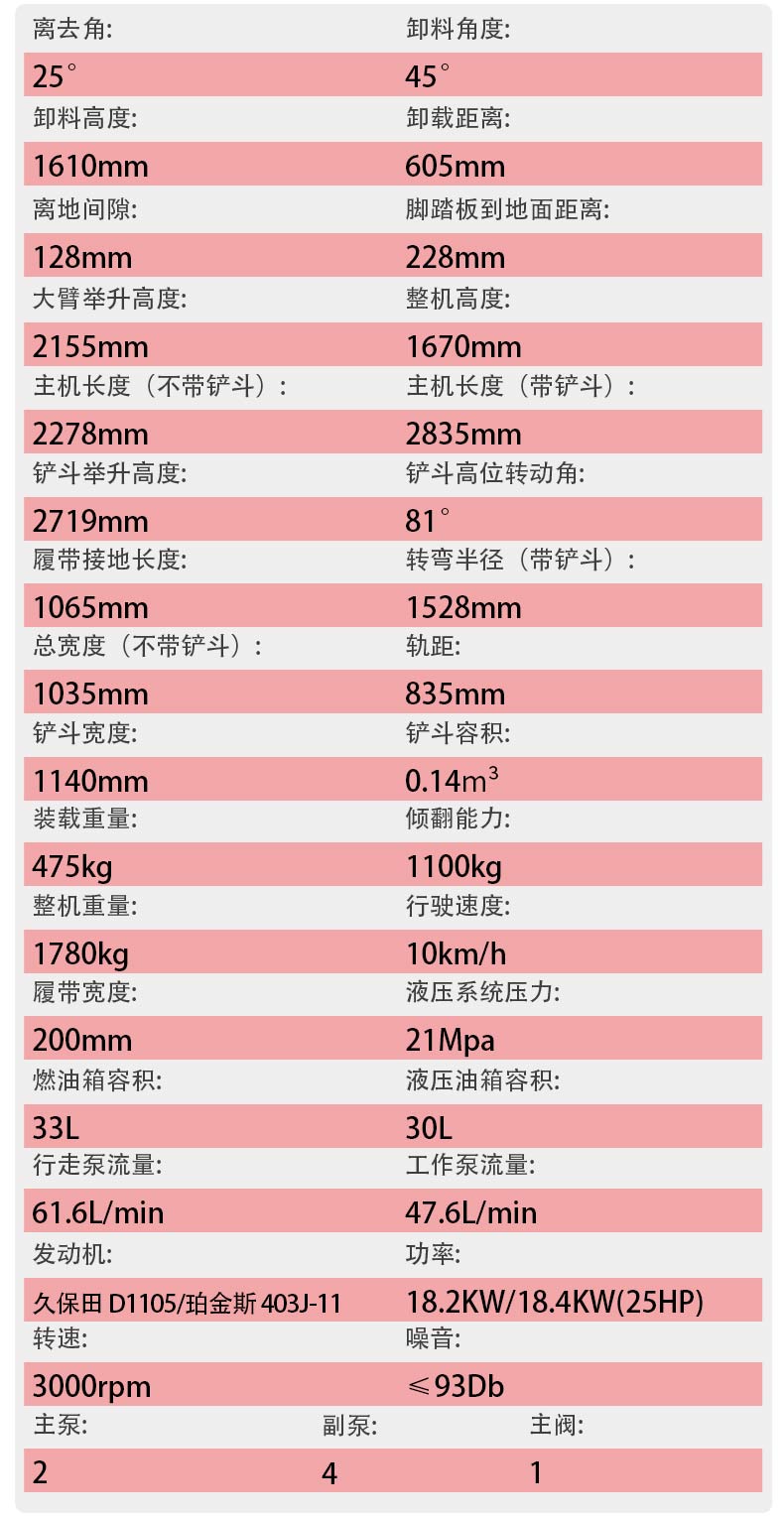 搭載久保田D1105或珀金斯403J-11知名品牌發(fā)動(dòng)機(jī),額定功率可達(dá)18.2KW/18.4KW(25HP),3000rpm的轉(zhuǎn)速確保動(dòng)力持續(xù)穩(wěn)定輸出。21Mpa的液壓系統(tǒng)壓力配合47.6L/min的工作泵流量、61.6L/min的行走泵流量,讓大臂舉升、鏟斗翻轉(zhuǎn)等動(dòng)作響應(yīng)迅速、動(dòng)力充沛。雙主泵+一副泵的液壓配置,進(jìn)一步提升了作業(yè)效率,輕松應(yīng)對(duì)高強(qiáng)度連續(xù)作業(yè)需求。